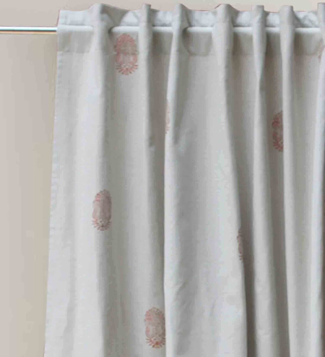 Block printed in Indian motif for your windows & doors. The rich handblocked design in bronze shade on a lt. green fabric displays a lavish look to any room. It can be paired with almost all upholstery colours. It is a thick curtain without lining & helps to block out the sunlight. The Curtain has hidden tab top for the pleats to fall properly. Seamlessly tailored for quality & durability.
