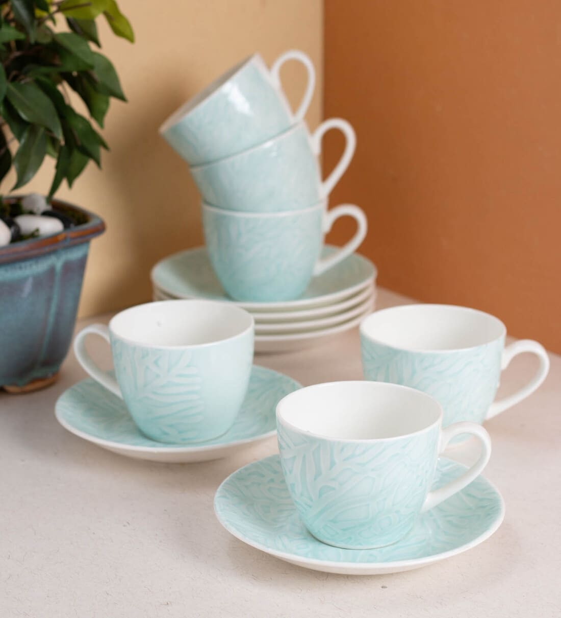 Cup & Saucer (6 Cup + 6 saucer) Dimension- 10.5*8*6.5 cm Capacity- 170 ml each Material-Fine Ceramic Microwave & Dishwasher Safe Always wash after use and store in a dry place.