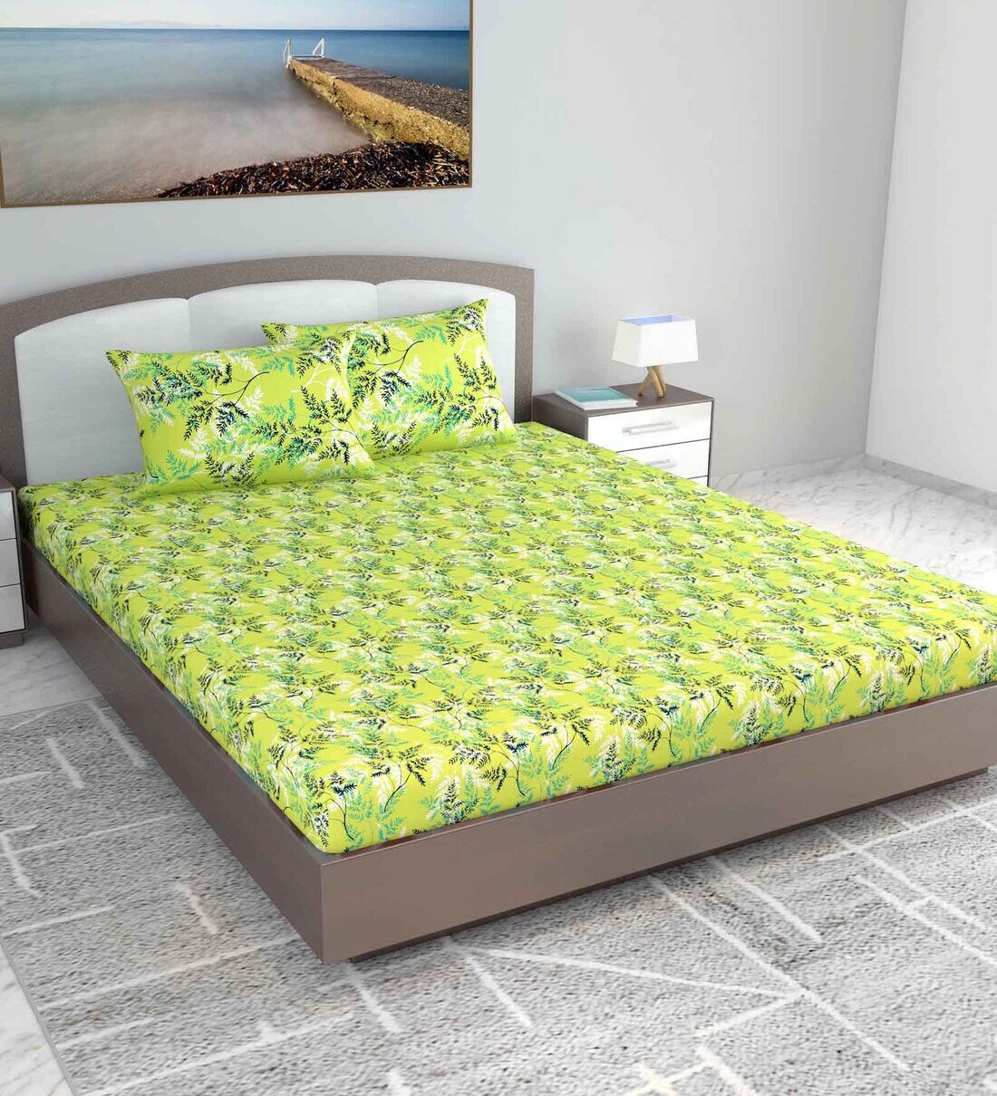 Green Floral 144 TC Cotton King Bedsheet with 2 Pillow Covers