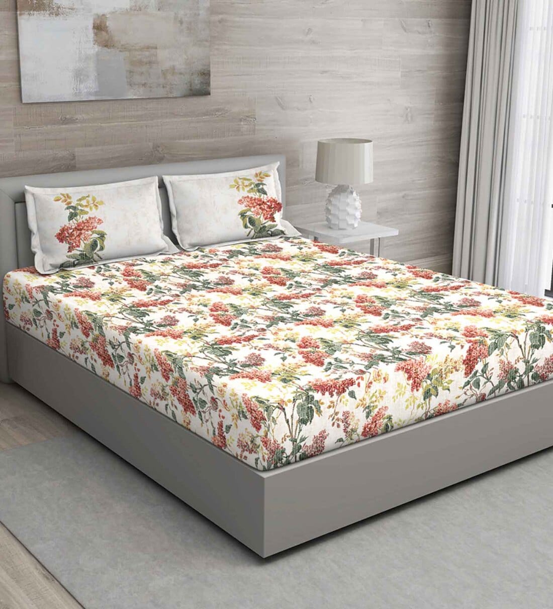 Green Floral 150 TC Cotton Queen Sized Bed Sheets with 2 Pillow Covers