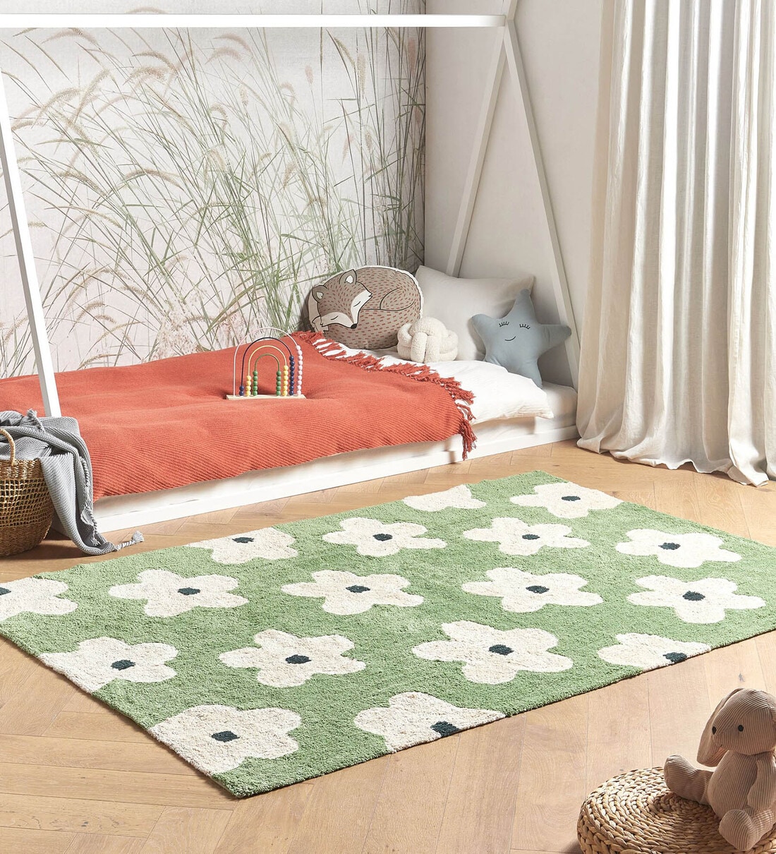 Green Floral Cotton 6 Ft X 4 Ft Hand Tufted Dhurrie