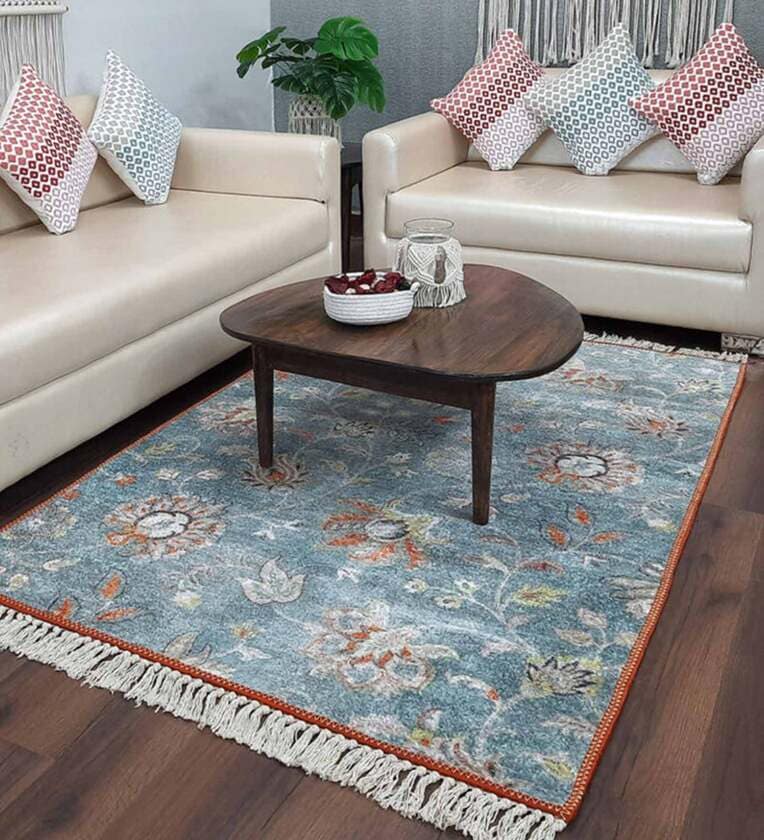 Green Floral Faux Silk 5 ft x 7 ft Hand Woven Carpet