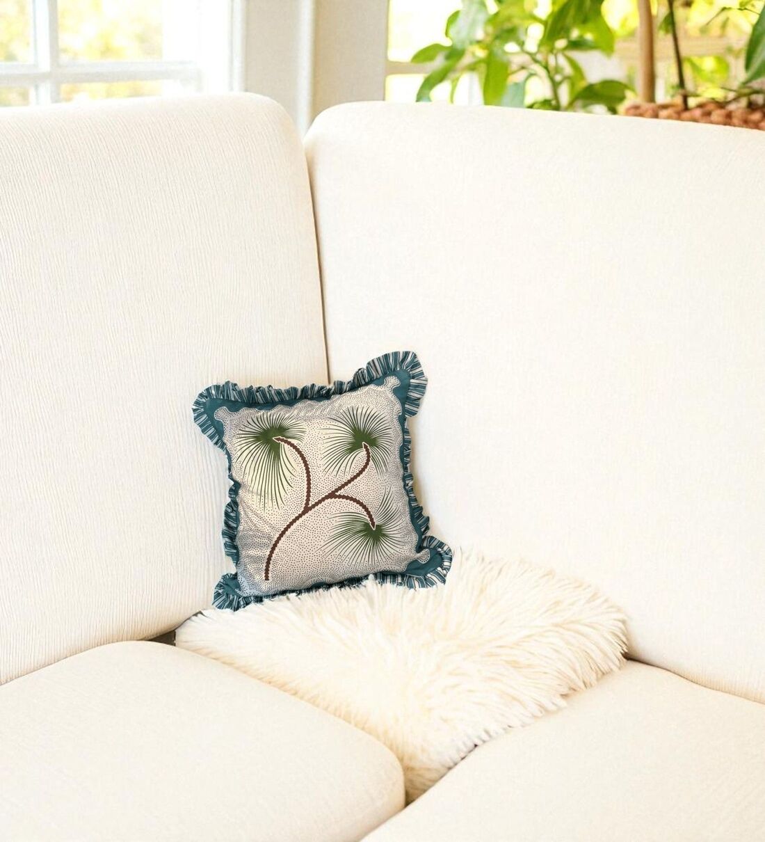 Bring tropical charm into your living space with the Palm Parade Ruffle Cushion Cover by Lushlyf. Designed in lush green and cream stripes, it features playful frill edges that add breezy, summer-inspired vibes. Crafted from pure cotton with a soft digital print, this 18x18-inch cover blends comfort with casual elegance perfect for refreshing your home d cor. Specifications Size: 18 x 18 inches Material: 100% Pure Cotton (Digital Print with Ruffle Edges) Color: Green & Cream Stripes Closure Type: Flap zipper for easy insert removal Product Includes: 1 Cushion Cover (Insert not included) Features Bold green stripes inspired by palm-lined getaways Frilled edges with contrast piping for a lively, stylish finish Breathable cotton fabric ideal for warm climates Durable flap zipper ensures neat look and convenience Care Instructions Gentle machine wash