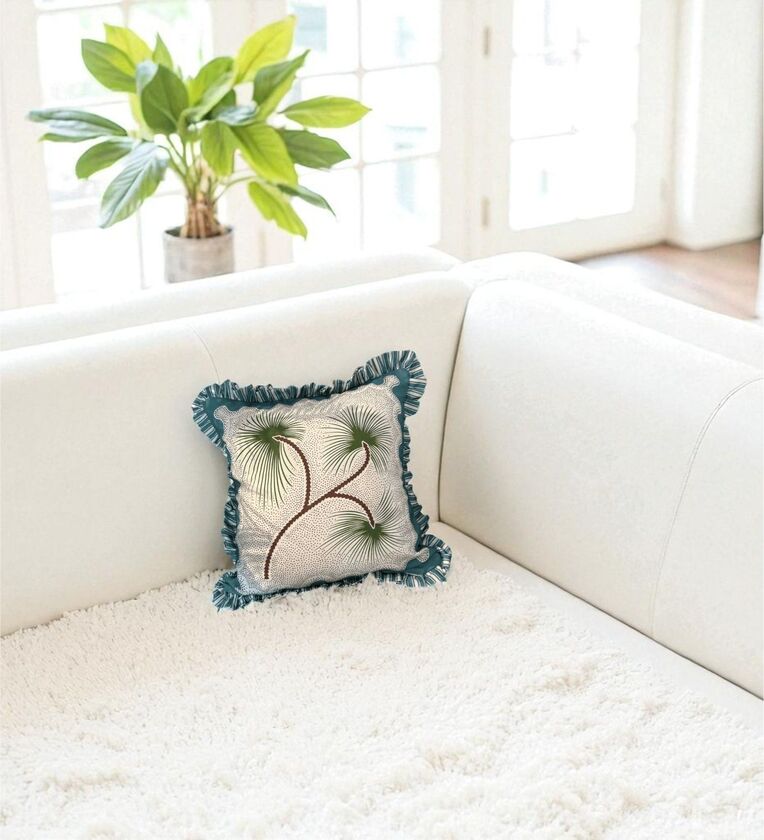 Add breezy elegance to your home with the Tropical Sway Ruffle Cushion Cover Green & Teal by Lushlyf. Featuring a lush palm frond digital print paired with striped ruffle edges, this cushion exudes a relaxed, island-inspired vibe. Perfect for nature lovers and summer moods, it s a stylish accent that refreshes any modern space. Specifications Size: 18 x 18 inches Material: 100% Pure Cotton (Digital Print with Ruffle Edges) Color: Green & Teal Palm Print on Off-White Base Closure Type: Concealed zipper for a neat finish Product Includes: 1 Cushion Cover (Insert not included) Features Vibrant palm frond digital print in tropical tones Striped ruffle detailing adds a playful charm Breathable, soft cotton fabric ensures comfort and durability Concealed zipper maintains clean, polished look