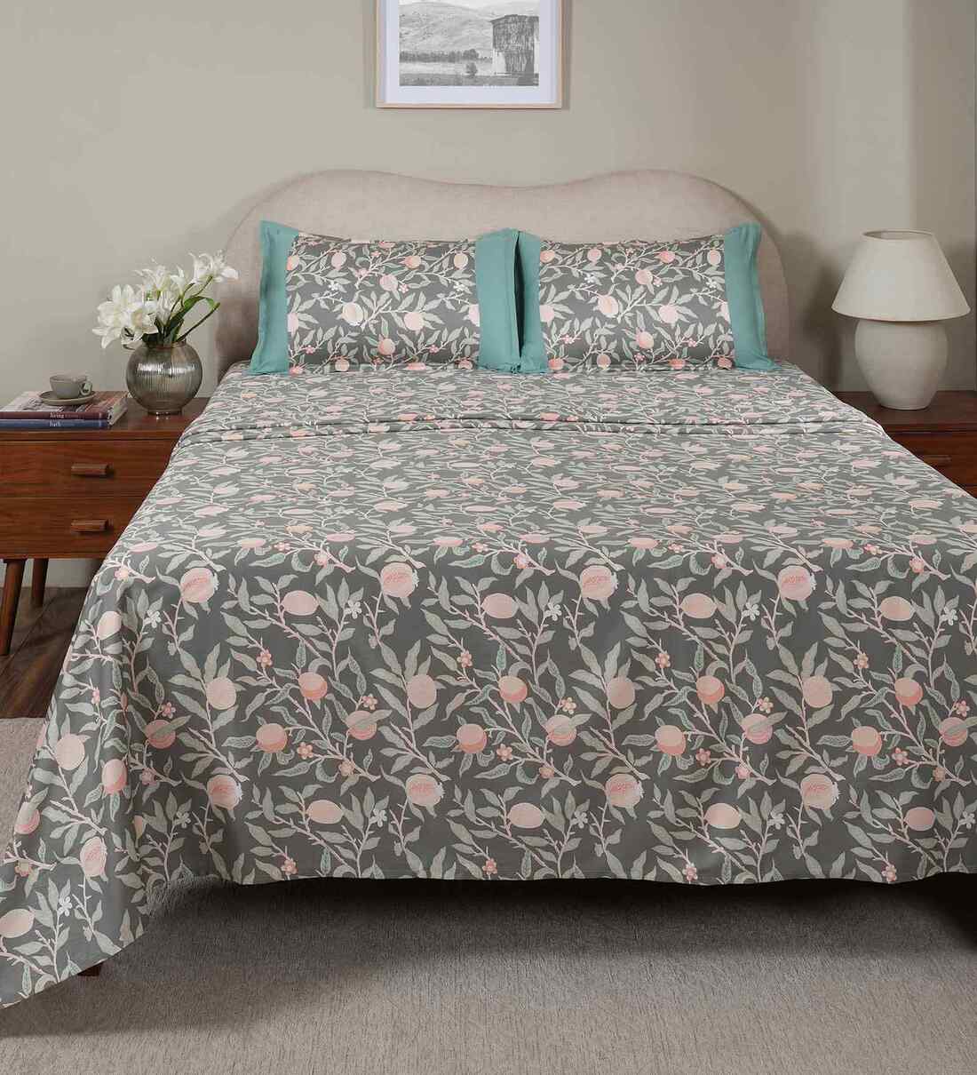 Green Fruit Print 200 TC Cotton Double Bed Sheet with 2 Pillow Covers Sensory Bloom Collection