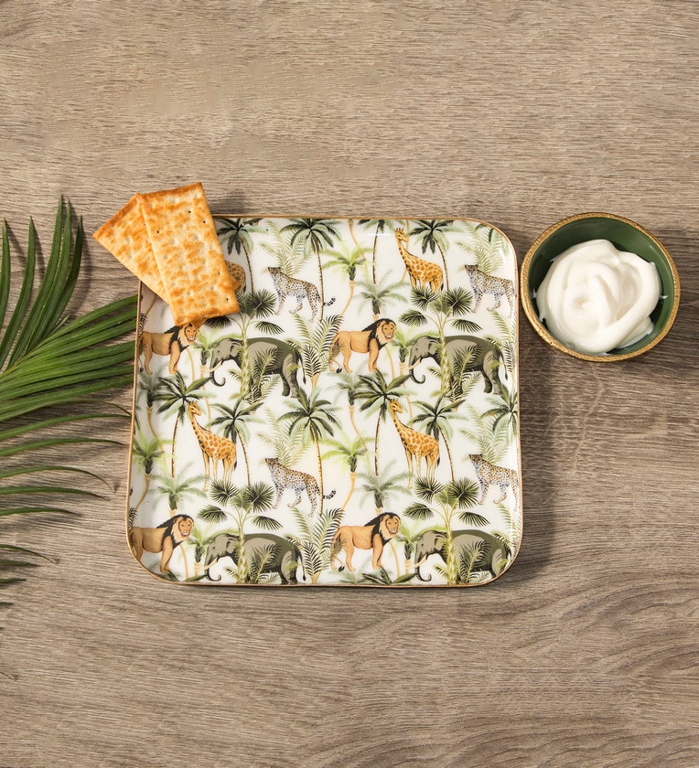 This Square shaped iron platter has a glossy enamel core with a lovely jungle safari print that adds grace to your table setting. It wears a coat of lacquer that meets international food safety standards. Paired with an aluminium dip bowl with, its ideal for serving snacks or passing nibbles at a party.These platter is a great gifting option for special occasions like birthdays, housewarming, festivals, holidays, anniversaries etc.