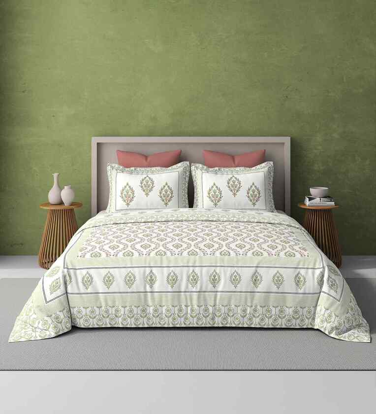 Green Jaipuri Blockprint 250 TC Pure Cotton King Sized Double Bedsheet with 2 Pillow Covers
