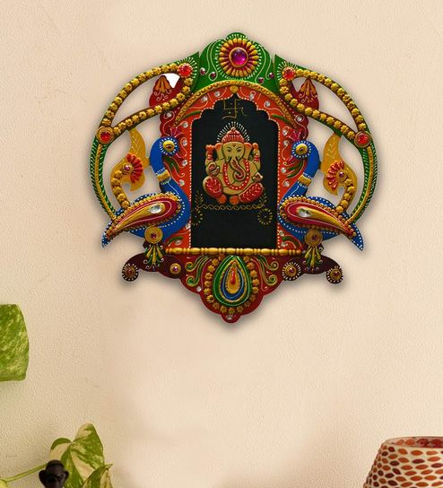 1 Piece Paper Mache Lord Ganesha With Peocock Wall Hanging