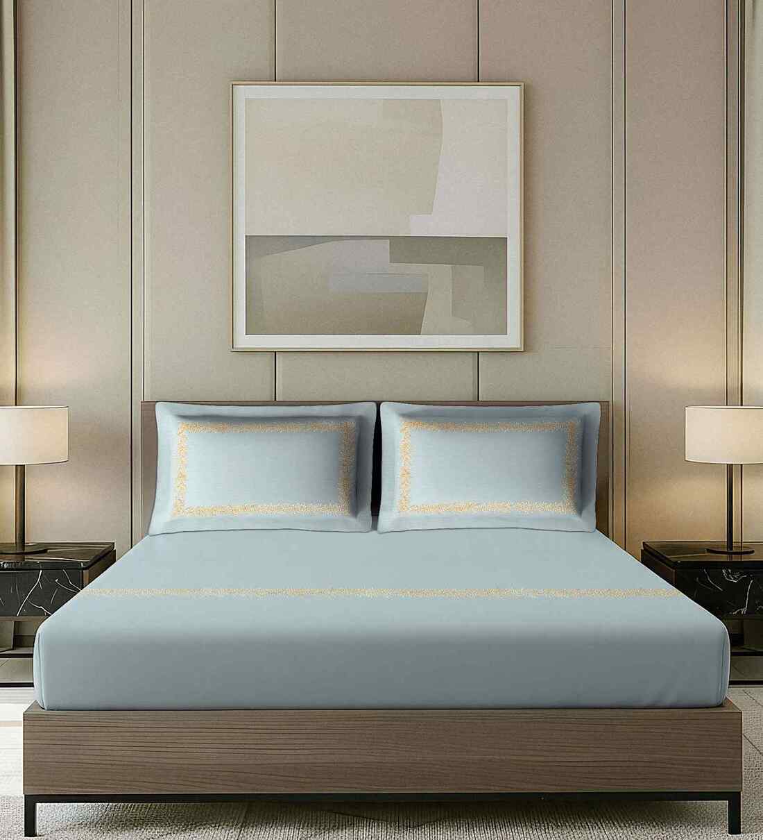 Green Solid Colour Base With Leaf Embroidery 500 TC Cotton King Double Bedsheet With 2 Pillow Covers