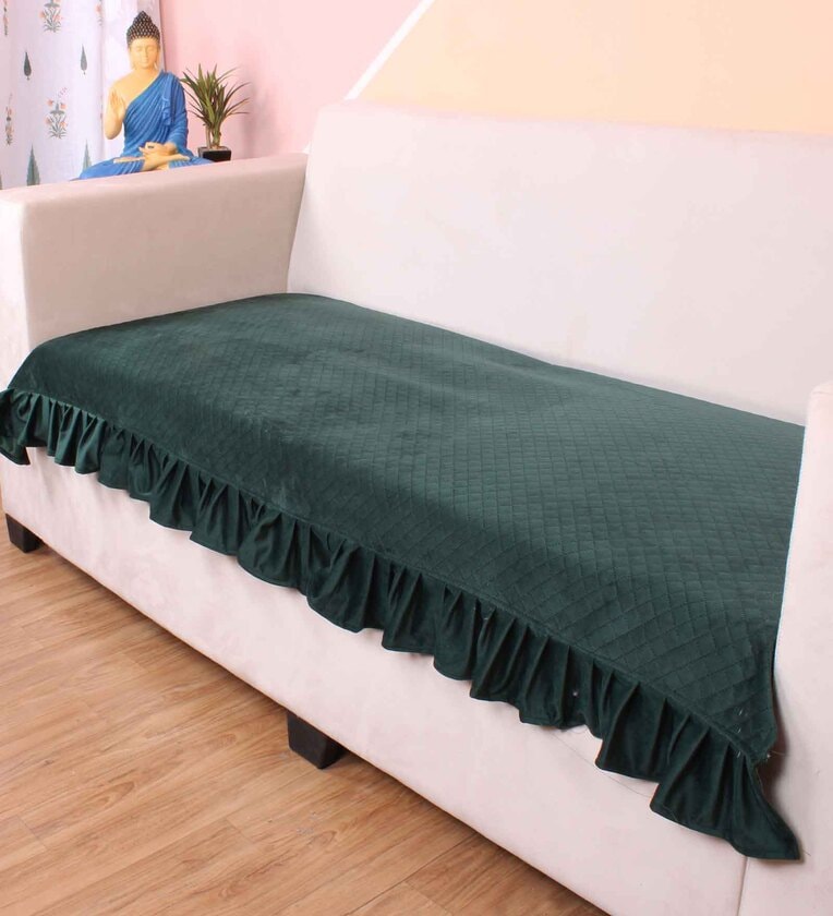Green Solid Velvet 2 Seater Quilted Sofa Cover (Protector) with Frill