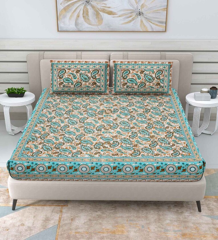 Green Traditional 144 TC Cotton Double Queen Bedsheet With 2 Pillow Covers