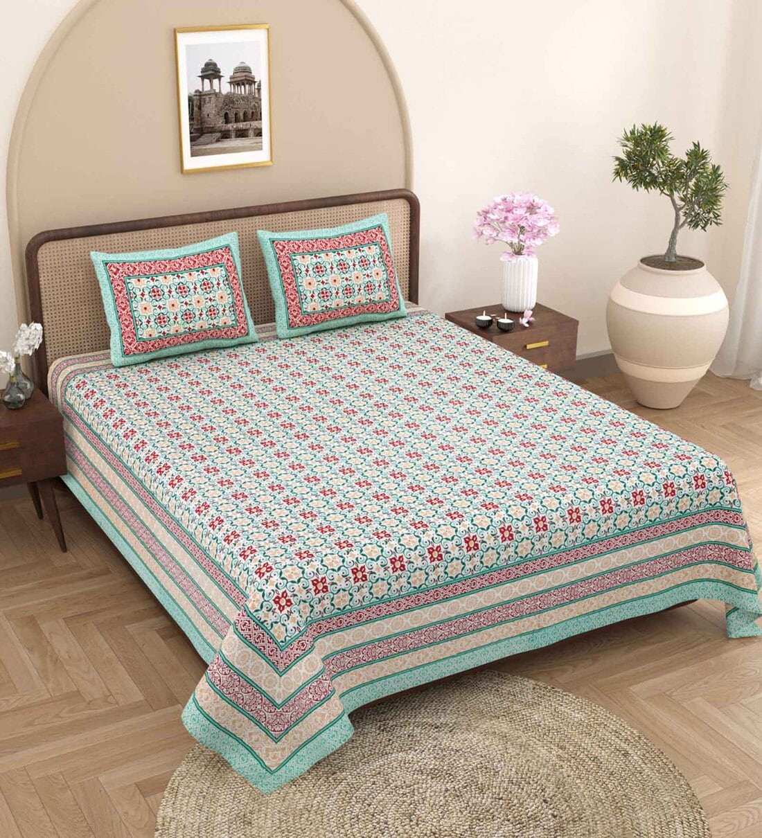 Green Traditional 240 TC Pure Cotton King Sized Double Bedsheet with 2 Pillow Covers