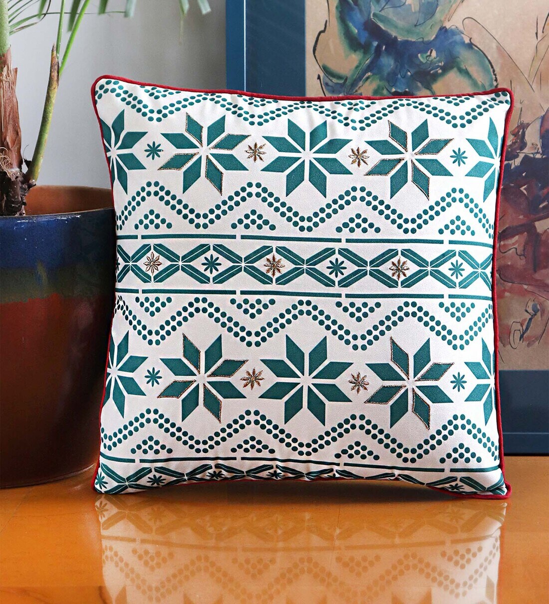 This green 16x16 inch cushion cover can cheer you up by giving you comfort while taking care of the quality. Crafted from the best quality cotton polyester blend fabric, it features a beautiful Digital Print with Cord Piping and Anti Golden Zari pattern that adds an ornamental value to your home decor.