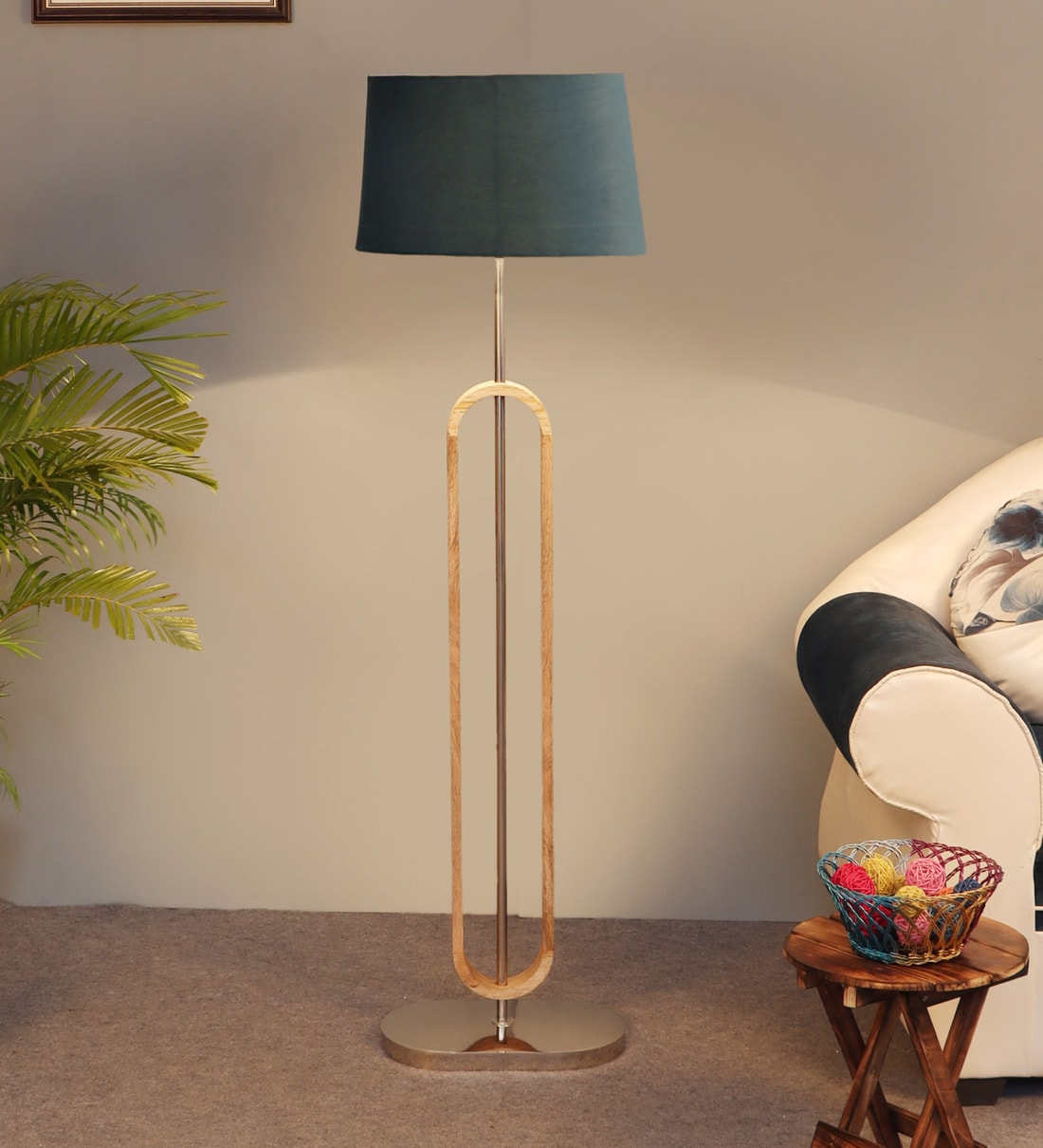 Grey Cloth Shade Club Floor Lamp With Wood & Iron Base