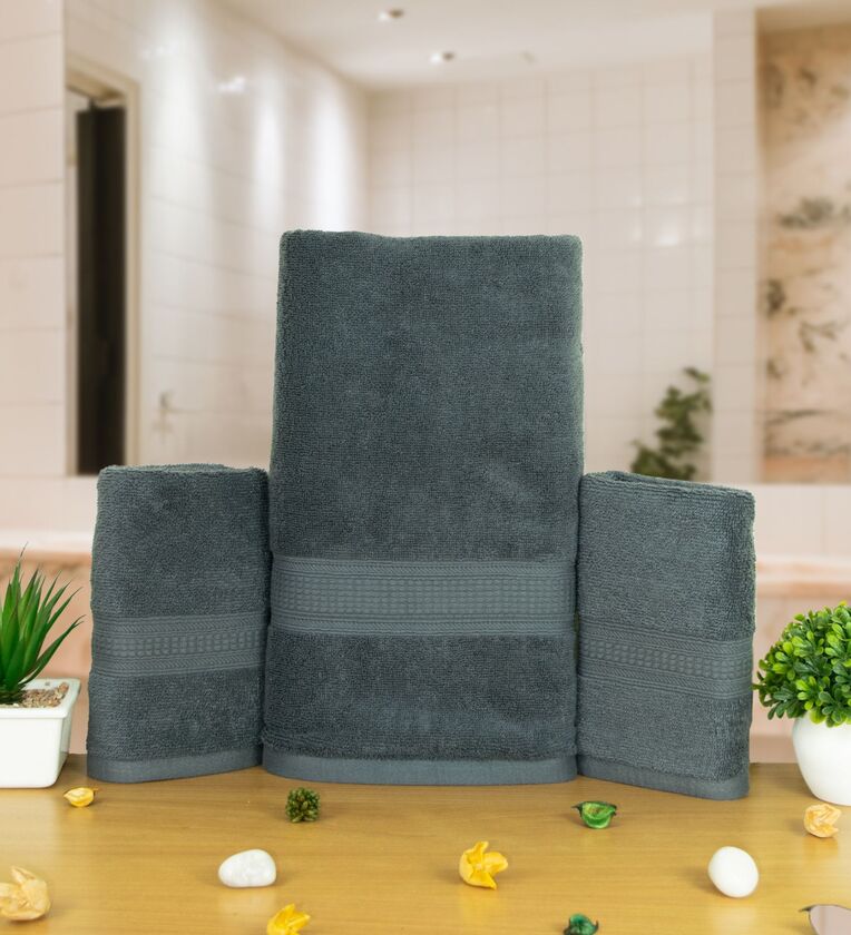 Grey Cotton Solid 500 GSM Bath & Hand Towels Pack of 3 (1Bath 2 Hand)
