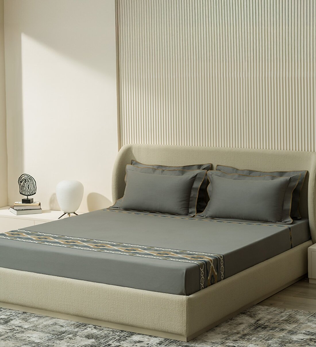Grey Embroidered 210 TC Cotton King Sized Bedsheet with 2 Pillow Covers