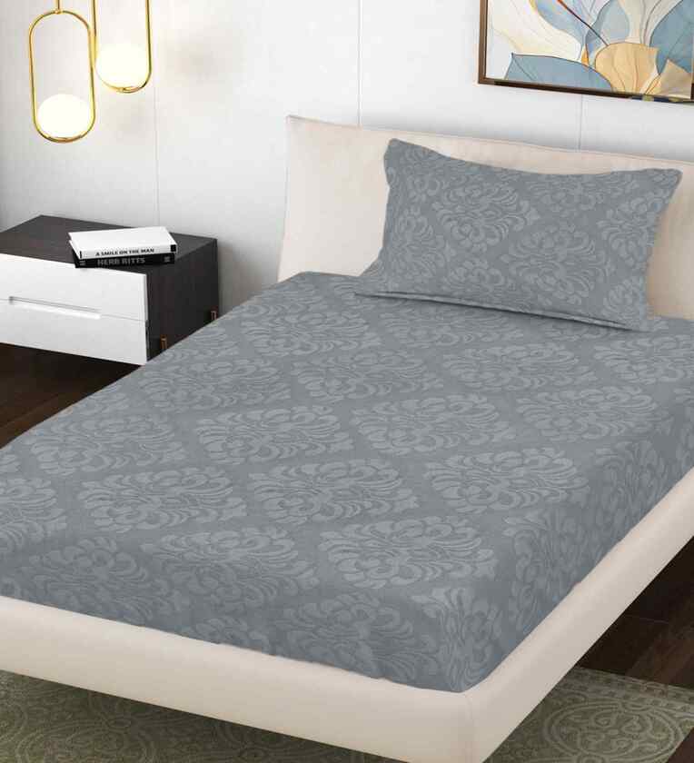 Grey Ethnic 300 TC Cotton Blend Embossed Single Bedsheet with 1 Pillow Cover