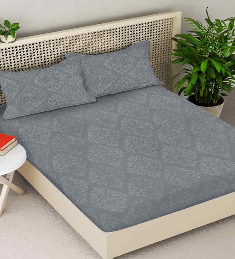 Grey Ethnic 300 TC Cotton Blend King Size Fitted Embossed Double Bedsheet with 2 Pillow Covers