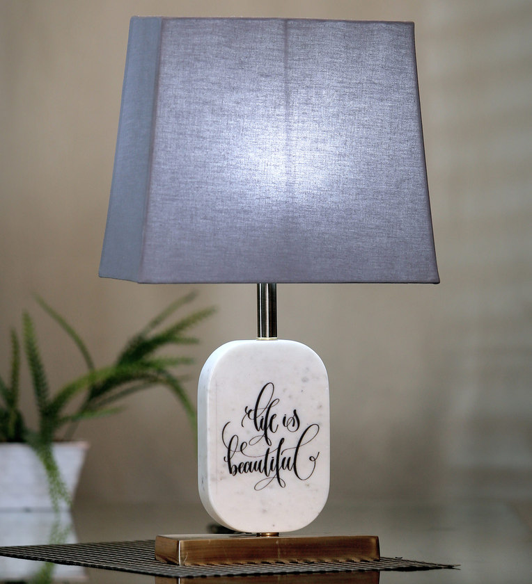 Grey Fabric Shade Marble Table LED Lamp With Antique Brass Base