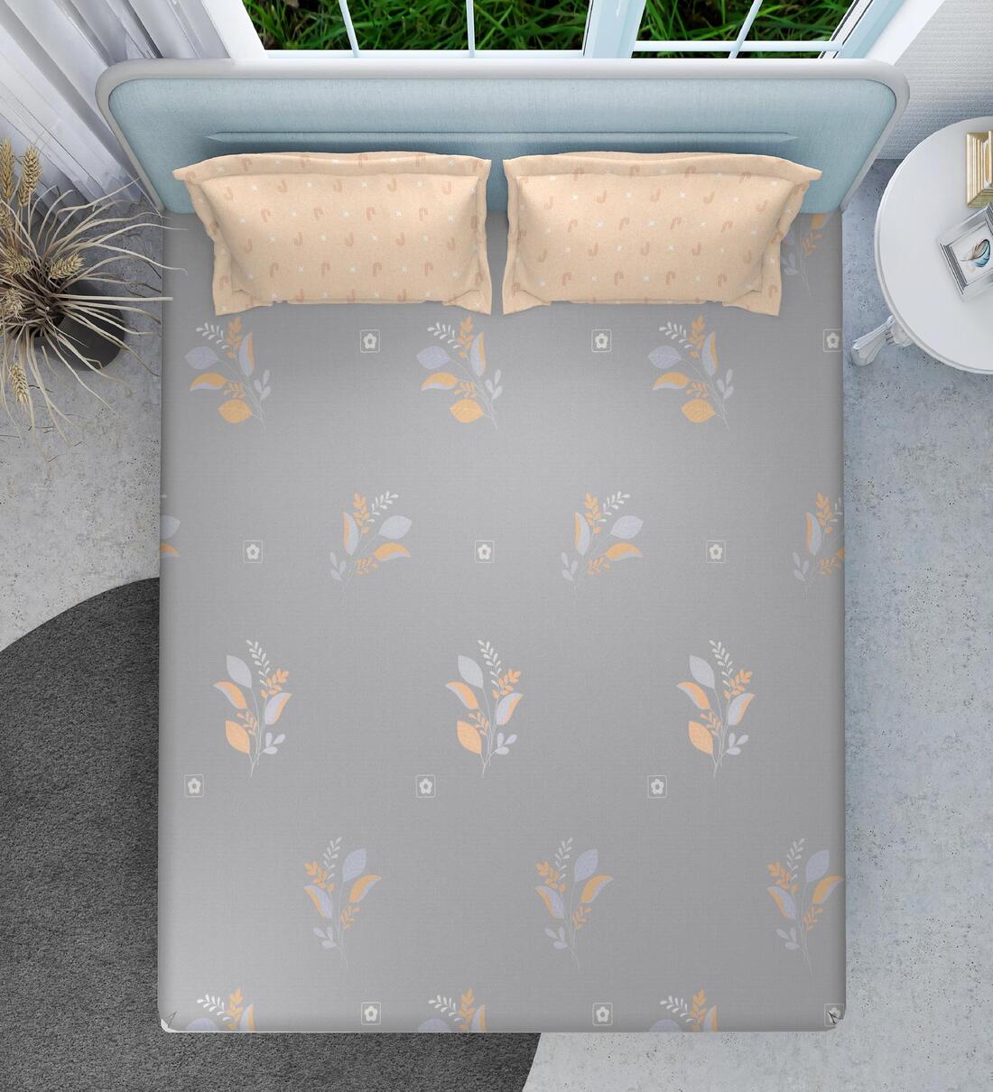 Grey Floral 160 TC Microfiber Queen Sized Double Bedsheet with 2 Pillow Covers Petal Harmony Collection