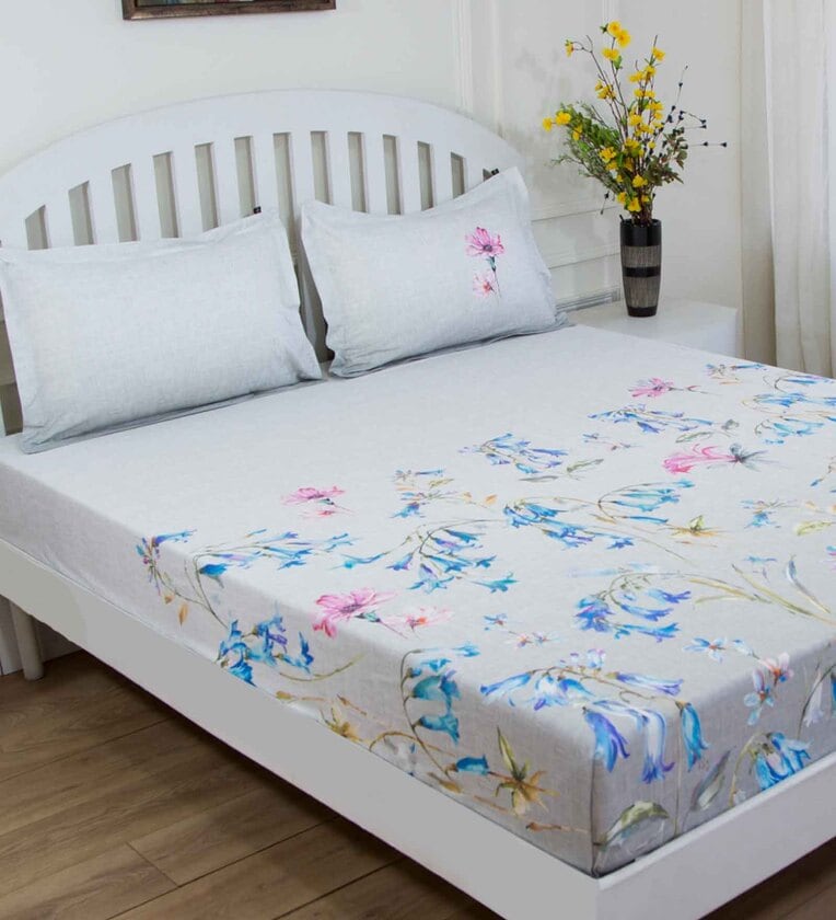 Grey Floral 180 TC Cotton Queen Sized Bed Sheets with 2 Pillow Covers
