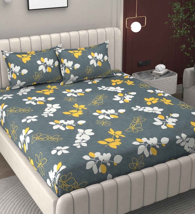 Grey Floral 250 TC Microfiber King Size Double Bedsheet Fitted Microfiber With 2 Matching Pillow Covers