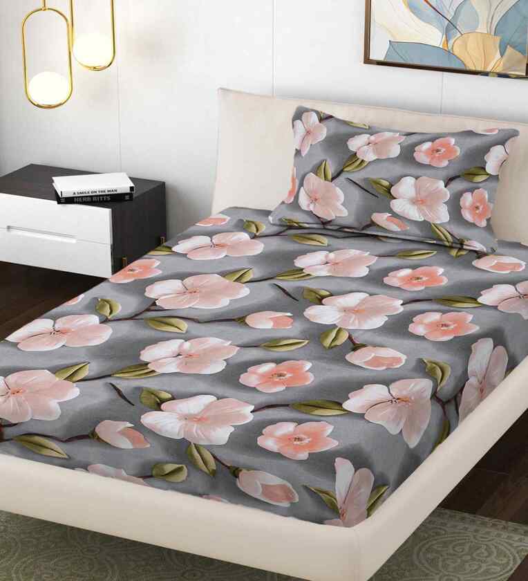 Grey Floral 300 TC Cotton Blend 7D Single Bedsheet with 1 Pillow Cover