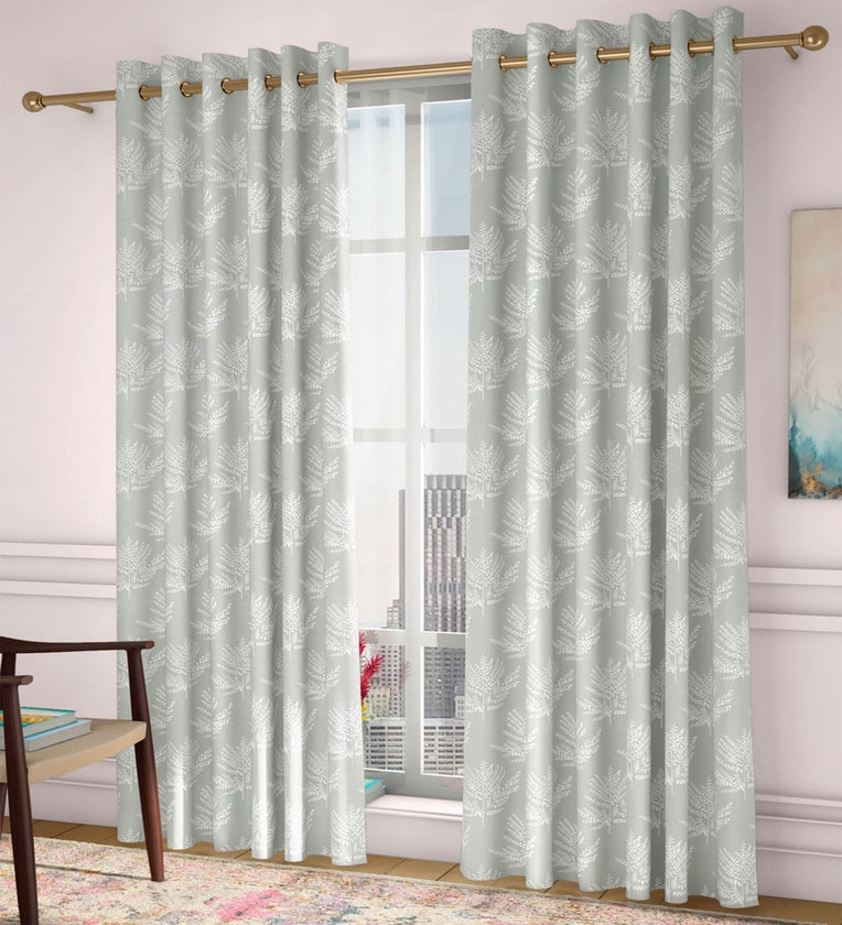 Grey Floral Poly Cotton 5 Ft Light Filtering Eyelet Window Curtains (Set of 2)