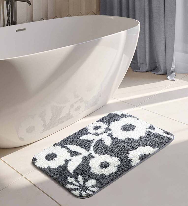 Grey Floral Polyester 28x20 Inches Anti Skid Bath Mat