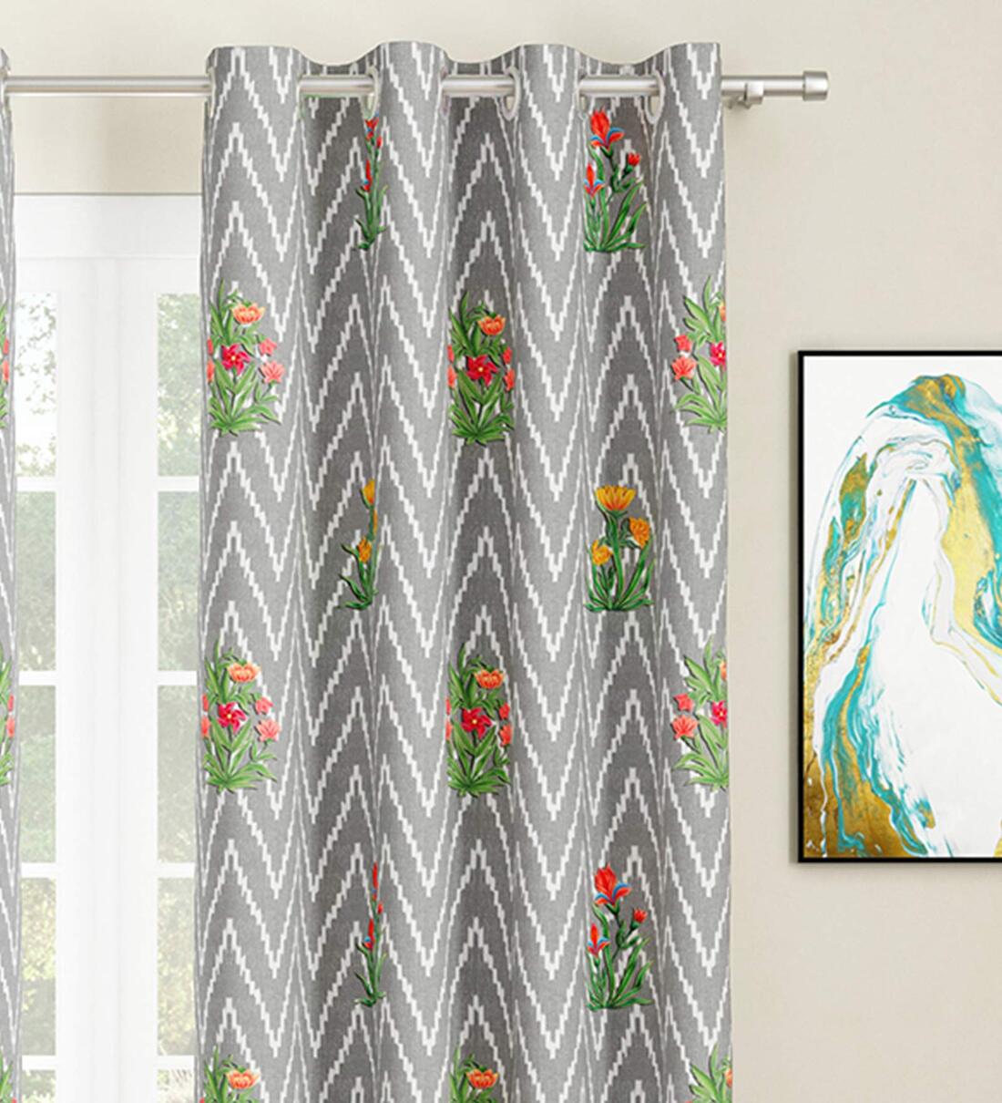 Grey Floral Polyester 7 Ft Light Filtering Eyelet Door Curtains (Set of 2)