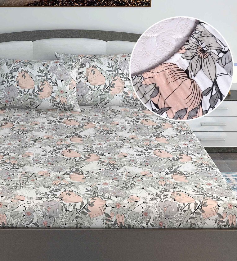 Grey Geometric 144 TC Cotton King Fitted Bedsheet with 2 Pillow Covers