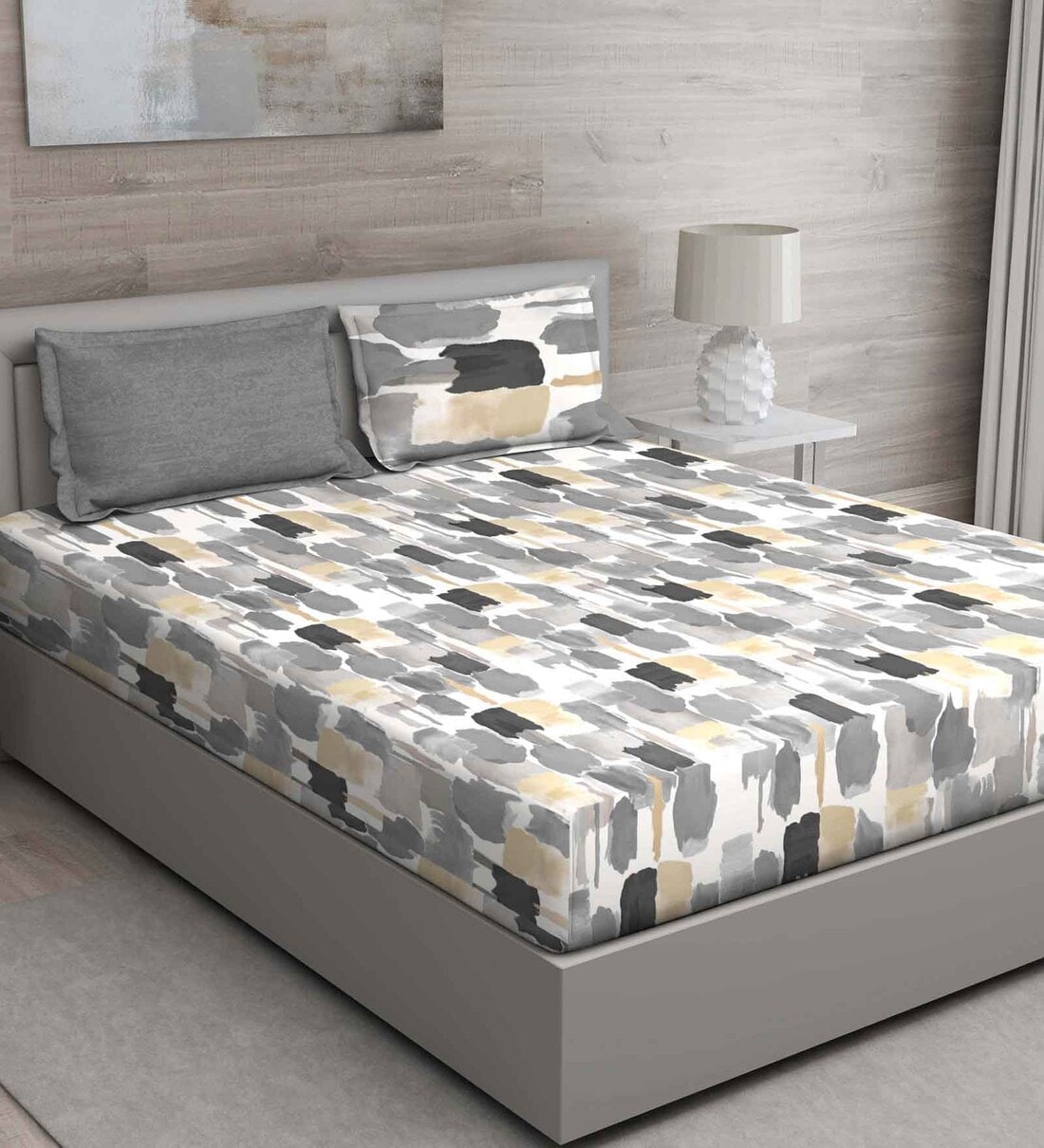 Grey Geometric 144 TC Cotton King Sized Bed Sheets with 2 Pillow Covers