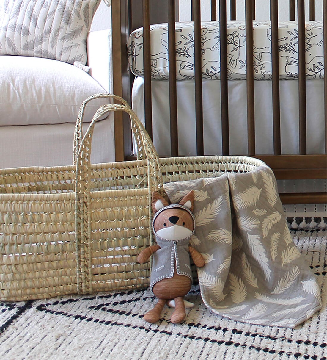 Our reversible muslin jacquard blanket is the perfect boho accent to your nursery or to take along for a stroll through the neighborhood. Made with 100% cotton, its lightweight, yet still soft and cozy. Available in 3 designs, including copper moon, rainbow and feather. Mix and match with our Crane Baby bedding for an eclectic look.