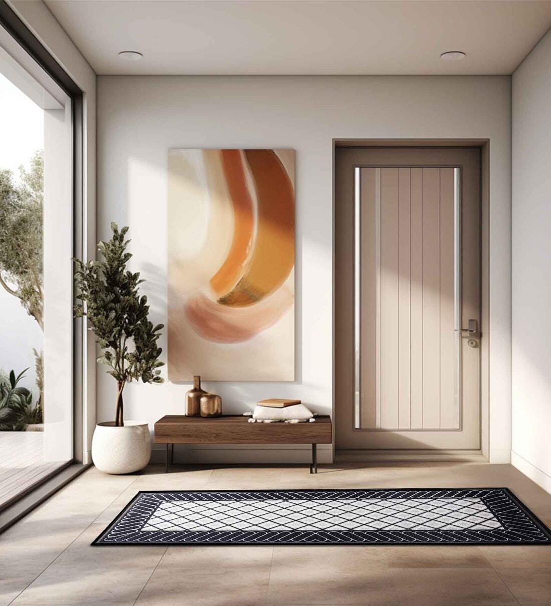 If youre someone who loves a minimalist vibe to your home decor, then this runner is for you. With black line art in the borders, this beautiful runner is a keeper! While giving your home an aesthetic vibe, it is also easy to maintain.