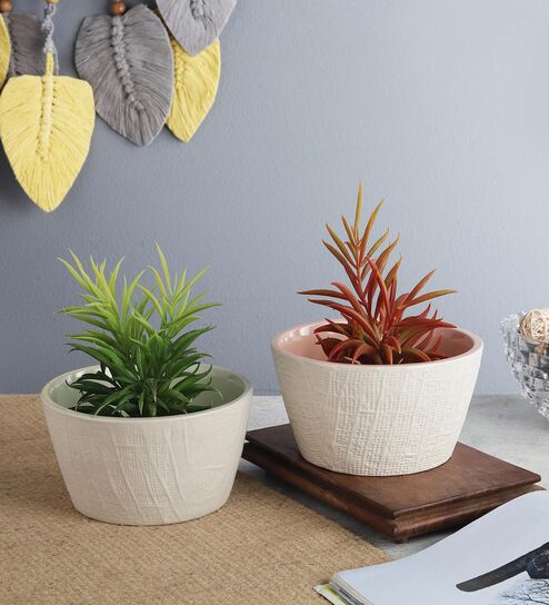 Grey, Pink & Green Ceramic Textured Planter, Set of 2