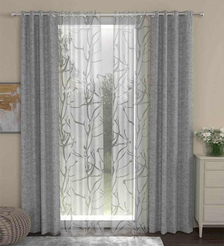 Grey Solid Poly Cotton 7 Ft Semisheer Eyelet Door Curtains (Set of 4)