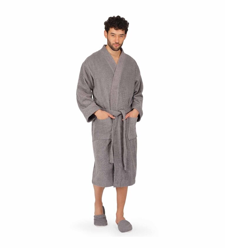 Grey Solid 100% Cotton Unisex Bathrobe With Slippers (XL)