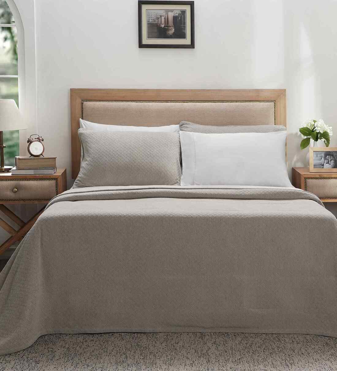 100% Cotton Bed Cover. Soft textued diamond pattern all over to enhance the aesthetics. Easy care finish to ensure low wrinkle effect. Processed to provide lustre and smooth finish to the fabric. Multi utility product can be used as blanket, bed throw. Bed cover has high color fastness making it look as good as new for a longer period of time. Can be used as blanket.