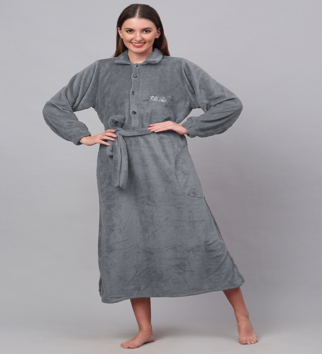 Grey Solid Woolen Women Bath Robe With Belt (XL)