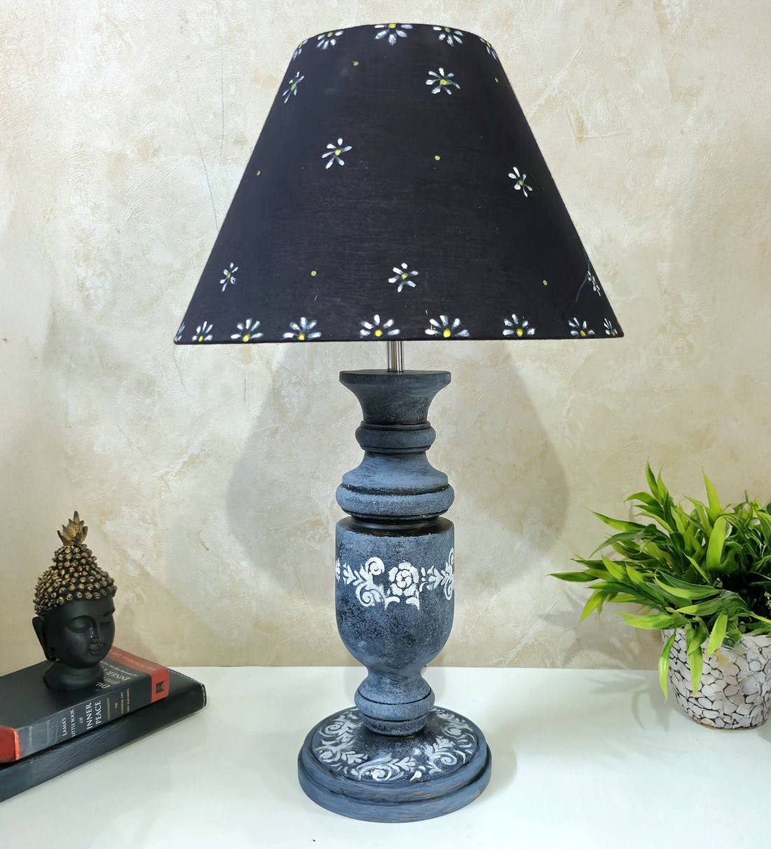 Grey Stone Finish Handpainted and hancarved Distress wooden Table lamp in Vaase handcarved design with handpainted fabric shade