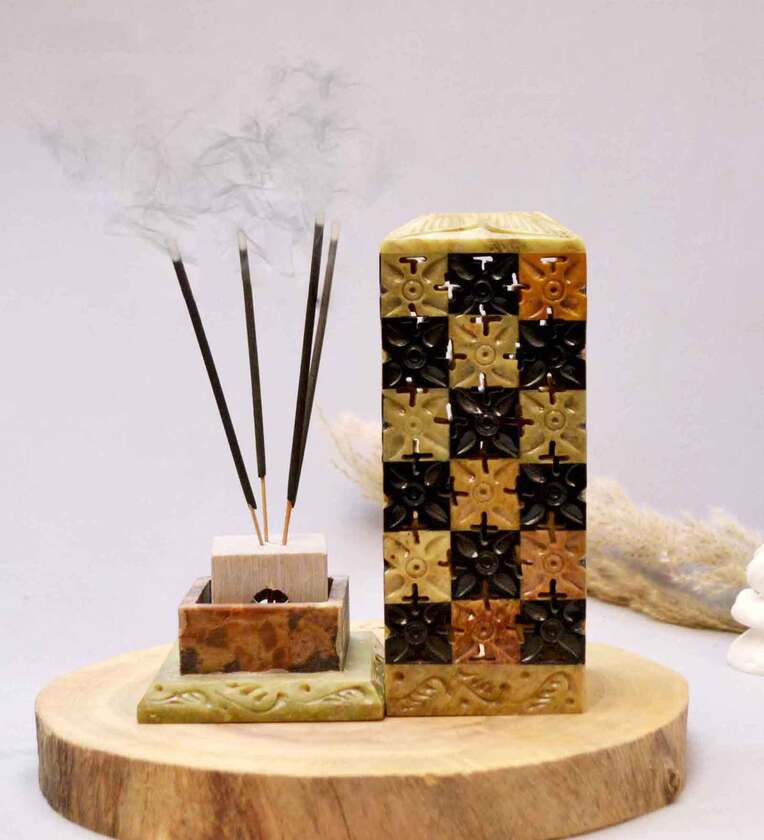 Hand Carved Soapstone Incense Holder/Candle Holder. This Incense stick holder handcrafted from soapstone with the finest shape and Carving work for holding incense sticks. Soapstone Incense holder comes with a 'secretive' compartment provided below that will retain the freshness and fragrance of the incense. Light your favorite incense sticks and indulge yourself in an aromatic ambience after a long tiring day. It has compartment to hold different sized Candles and incense. This master Piece is made from hand very carefully. The vertical structure of this incense holder for sticks can be detached from the base support which has a central slot to fix the incense sticks firmly in place and allows for the ash to fall evenly inside the structure thereby avoiding a spill-over. It is renowned for its durability, beauty and intricacy. It makes a beautiful Gift for loved ones and an attractive addition for your home decor. Its creates positivety around having such a master art piece. This work is crafted by traditional artisans based in India and who are descendant from families who built the first wonder The Taj Mahal.