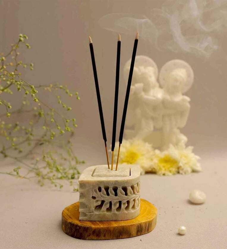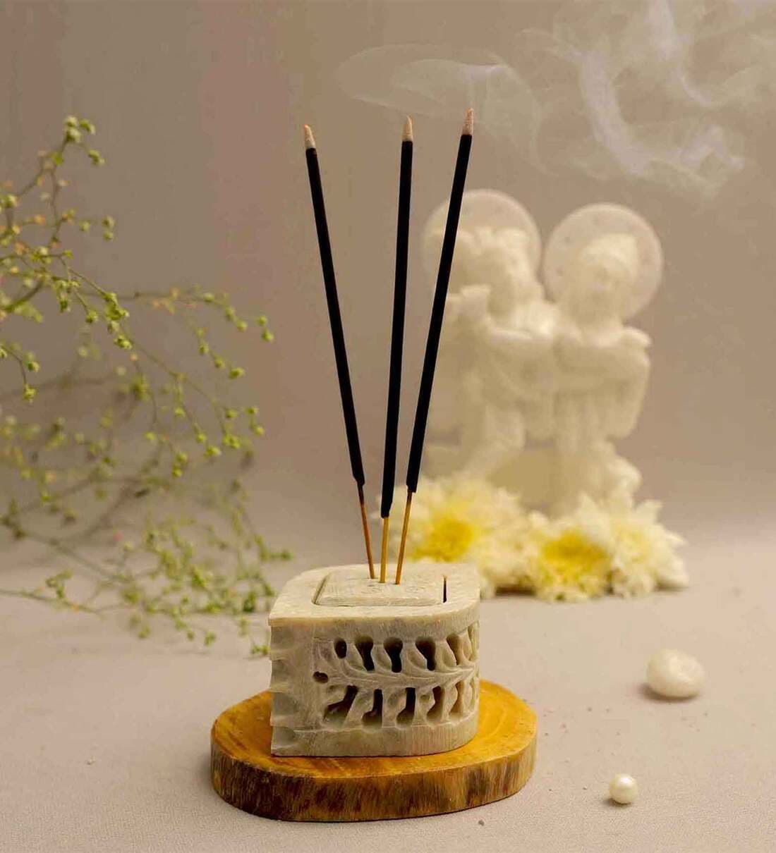Hand Carved Soapstone Incense Holder/Candle Holder. This Incense stick holder handcrafted from soapstone with the finest shape and Carving work for holding incense sticks. Soapstone Incense holder comes with a 'secretive' compartment provided below that will retain the freshness and fragrance of the incense. Light your favorite incense sticks and indulge yourself in an aromatic ambience after a long tiring day. It has compartment to hold different sized Candles and 5 incense. This master Piece is made from hand very carefully. The vertical structure of this incense holder for sticks can be detached from the base support which has a central slot to fix the incense sticks firmly in place and allows for the ash to fall evenly inside the structure thereby avoiding a spill-over. It is renowned for its durability, beauty and intricacy. It makes a beautiful Gift for loved ones and an attractive addition for your home decor. Its creates positivety around having such a master art piece. This work is crafted by traditional artisans based in India and who are descendant from families who built the first wonder The Taj Mahal.