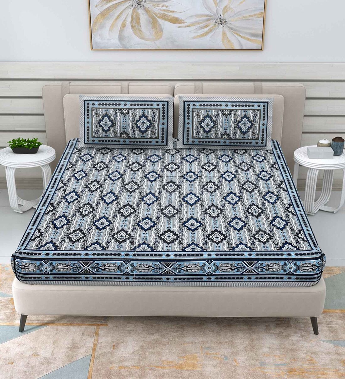 Blue and Grey Traditional 144 TC Cotton Double Queen Bedsheet With 2 Pillow Covers