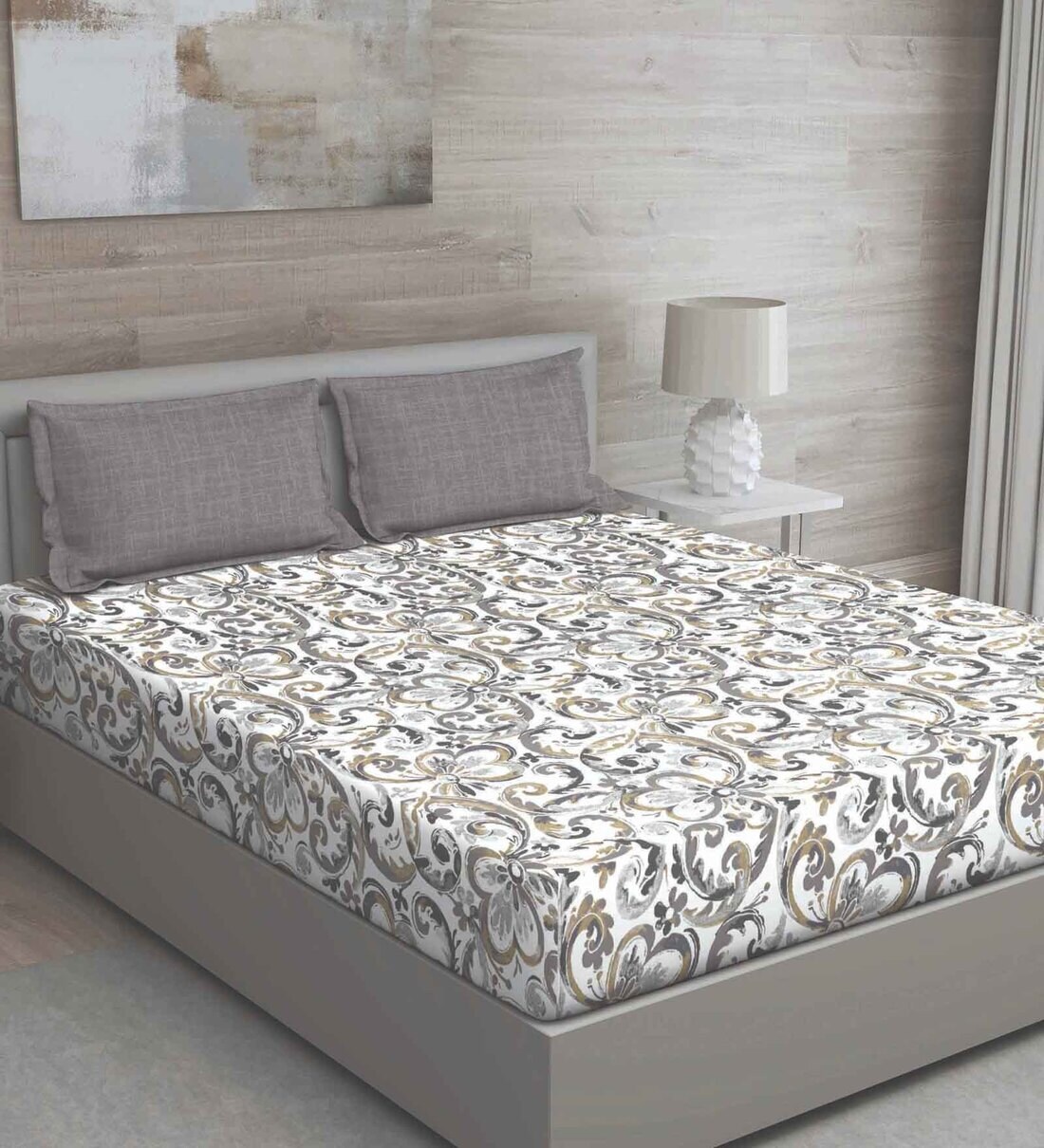 Grey Traditional 144 TC Cotton Queen Sized Bed Sheets with 2 Pillow Covers