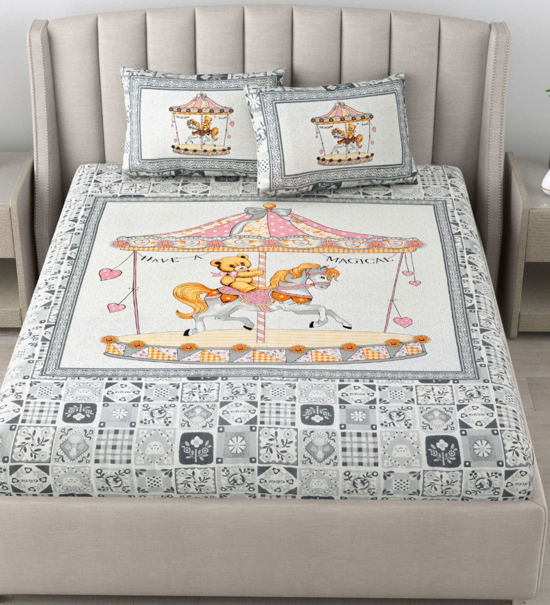 Grey Traditional 180 TC Cotton Printed Bedsheet With Two Pillow Covers For Queen Bed (Designer Printed ,Grey ,153 GSM)
