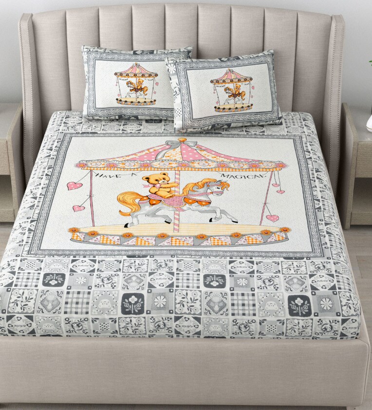 Material: 100% Cotton, soft and breathable. Thread Count: 180 TC for a smooth finish. Weight: 153 GSM, perfect for all seasons. Size: Designed to fit a double bed (approx. 90x108 inches) Includes: 1 Bedsheet + 2 Pillow Covers Care: Machine washable for easy maintenance