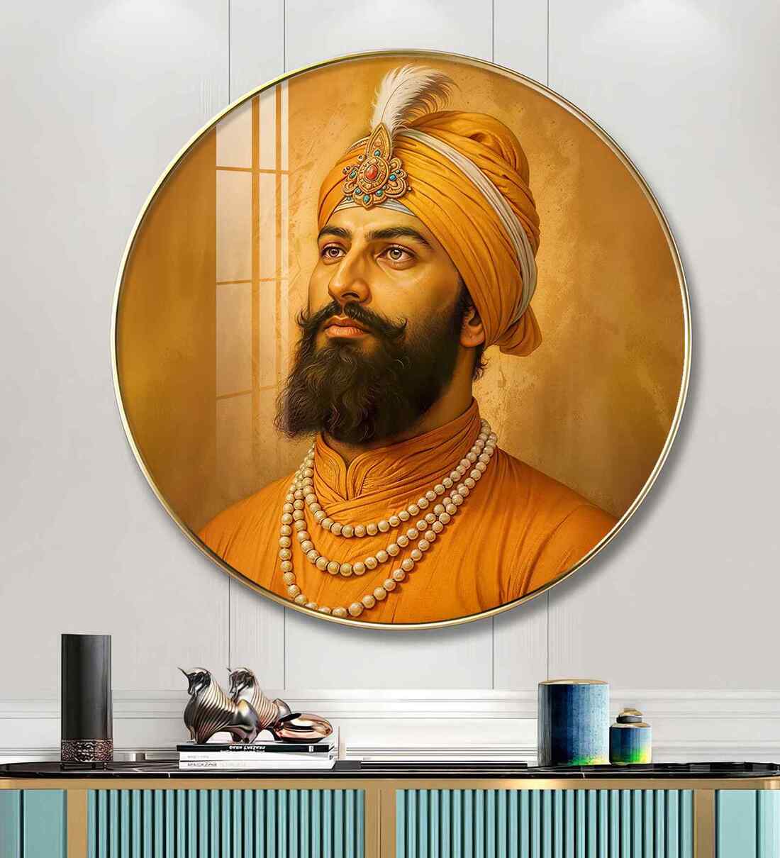 Bring home the timeless elegance of nature with our Guru Gobind Singh Wood Glass Finish Round Wall Art. The vibrant hues and intricate detailing of the design, a perfect balance of grace and grandeur, making it a captivating centerpiece for your living room, hallway or bedroom. Designed to symbolize prosperity, beauty, and positivity. High-definition print, Durable long-lasting quality material wall art perfect for modern and traditional interiors