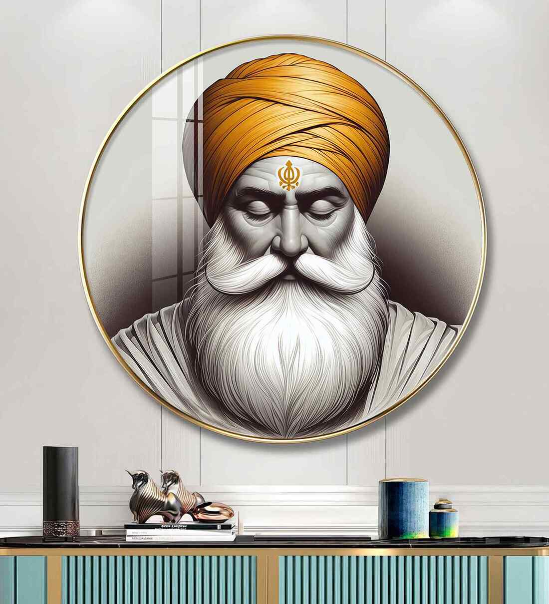 Bring home the timeless elegance of nature with our Guru Nanak Dev Wood Glass Finish Round Wall Art. The vibrant hues and intricate detailing of the design, a perfect balance of grace and grandeur, making it a captivating centerpiece for your living room, hallway or bedroom. Designed to symbolize prosperity, beauty, and positivity. High-definition print, Durable long-lasting quality material wall art perfect for modern and traditional interiors