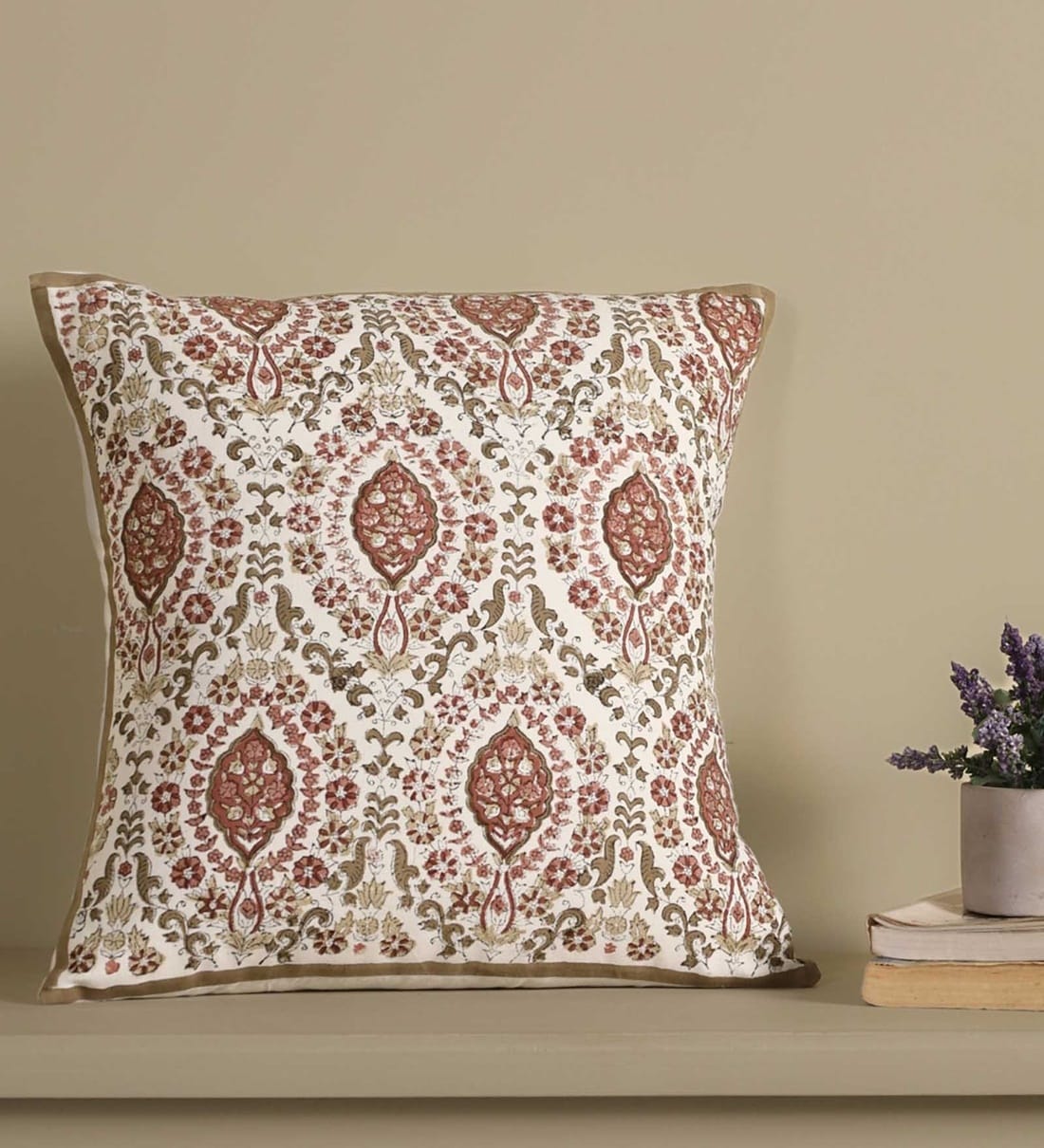 This set of 3 hand block printed cotton cushion covers in ivory and rust offers elegance and comfort. Each 18x18-inch cover is soft, versatile, and durable. Perfect for everyday use, festive d cor, or as a thoughtful gift for friends and family.
