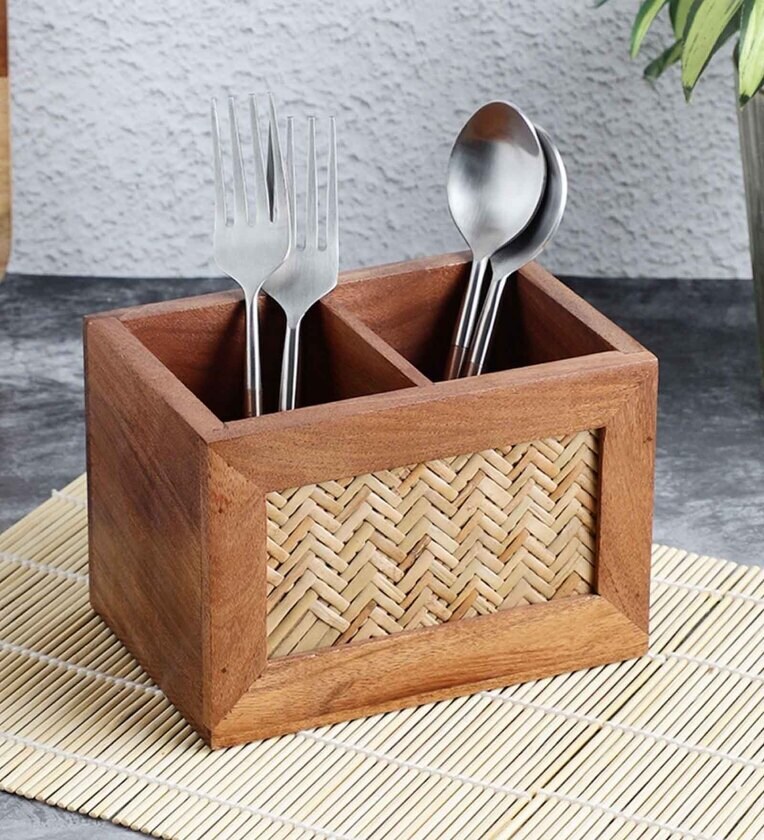 The bamboo is a light weight, flexible, tough, high tensile and economical natural material. Using this versatile and simple yet elegant base, VarEesha presents Bambusa kitchen and dining collection of hand crafted pieces with ethnic looks that can match today's modern style dining too. Made of Acacia wood, this collection showcases small dining accessories and serve-ware collectibles made with a mix of various types of wood with primary base as Bamboo mat rolls, that add a rustic charm to your dining experience. Each piece is hand-made uniquely and thus may differ slightly from the image in shade or pattern adding to its authentic natural look. Hand Crafted Acacia Wood Chatai Two Sections Spoon Holder is a part of this beautiful subtle range. Measuring 6x4x4 inches in lxbxh , it is convenient to handle and maintain. Eye catching & neat, this also makes an excellent choice for gifts.